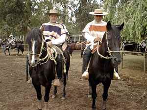 montados por jinetes con atuendo de huaso completo. La